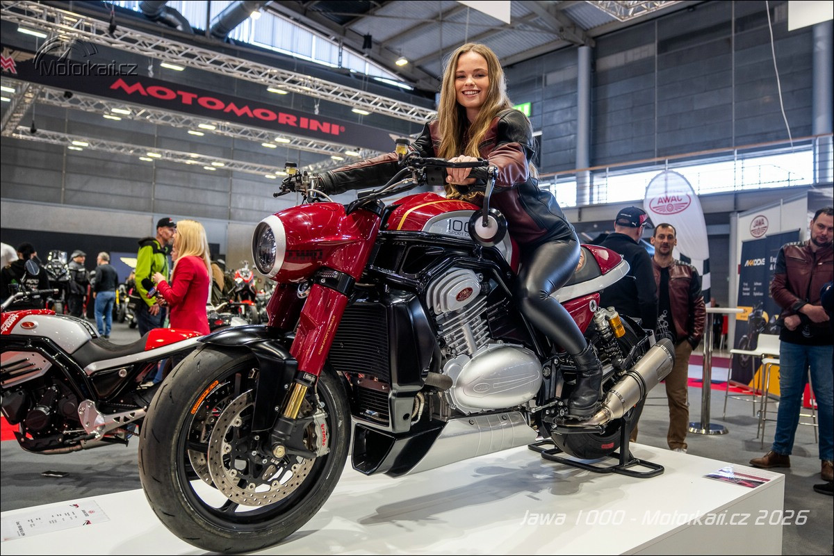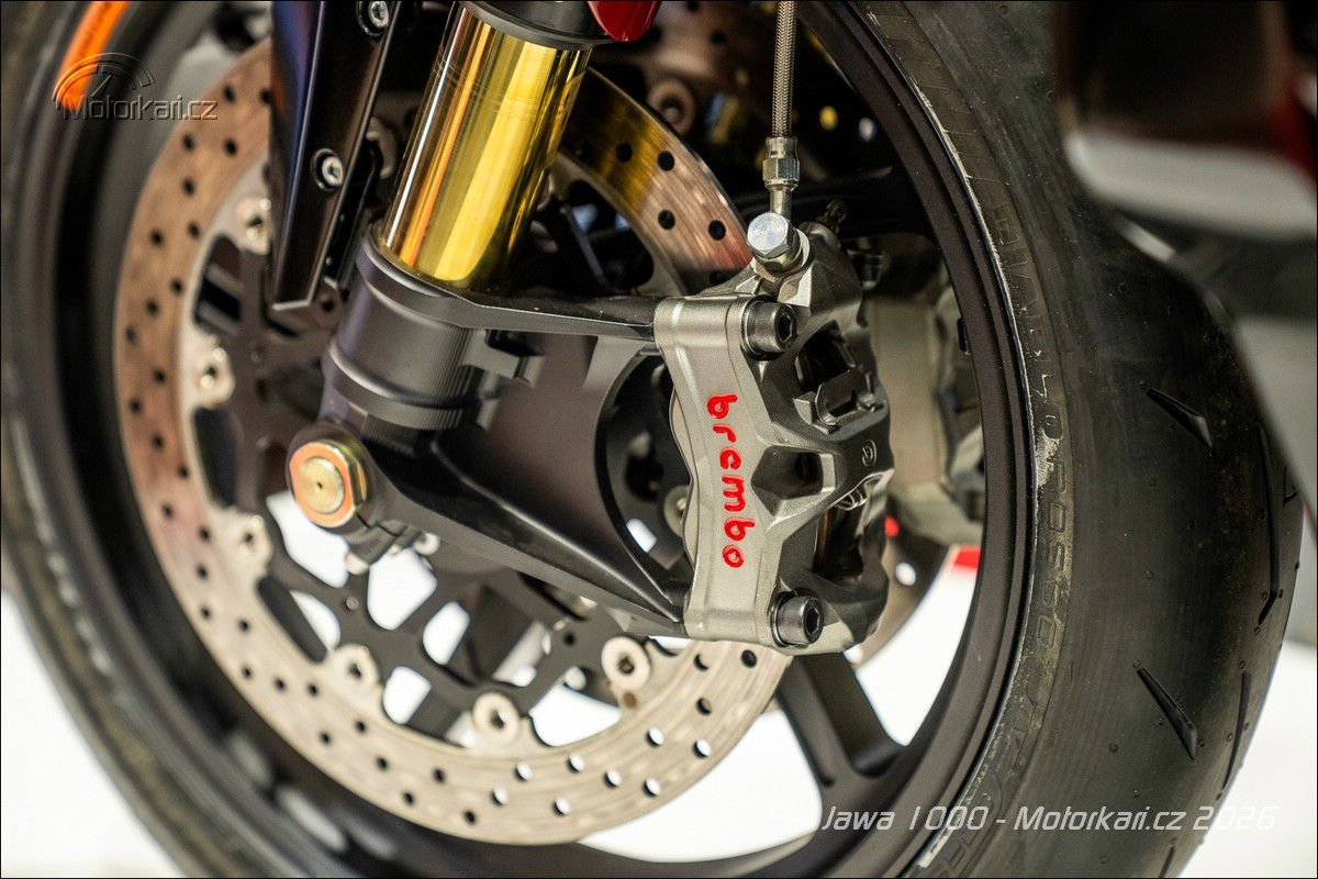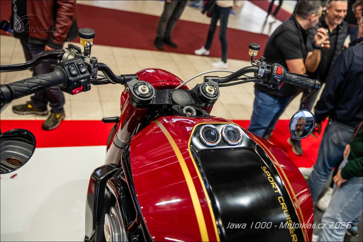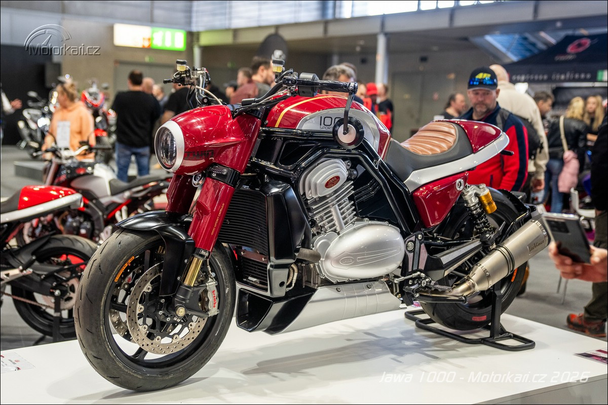 Vystavený jediný kus je samozřejmě ještě pořád prototyp a nemůže být vyvedený v jiné než typické červené jawácké barvě, doplněné o zlaté linky. Zatímco u sedm set třicítky budou barvy pevně dané (určitě jawácká červená, potom zřejmě i druhá vystavená světlá červená a nejspíše i černá), litr bude od začátku do konce personalizovaný podle přání majitele. Když si ten řekne, že chce motorku růžovou, tak ji dostane. Stejně tak odpružení je vystavené motorce Öhlins, ale jestli tam klient bude chtít Marzocchi nebo něco jiného, je na něm. Litr se totiž bude vyrábět na zakázku a rozhodně to nebude levná záležitost. Hovoří se zhruba o 1,5 milionu korun, přičemž se počítá s tím, že první (a kdoví, jestli nakonec ne i poslední) série bude mít 10-15 kusů. Litrová Jawa je tedy konečně již realitou, ale na silnici ji určitě moc potkávat nebudeme.